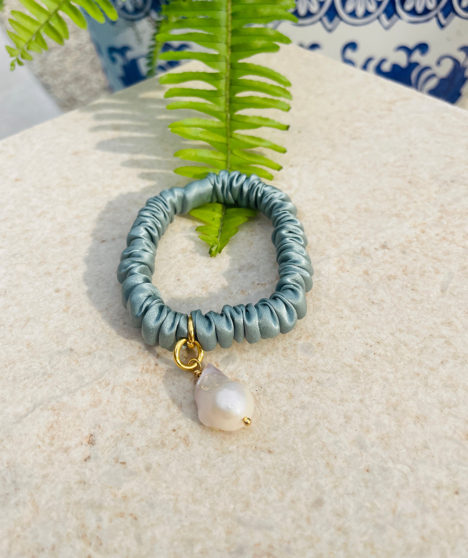 The Luxe Loop is a silk scrunchie reimagined as both a hair tie and a wearable accessory. Made with 100% mulberry silk, hand-selected freshwater pearl charms, and 18k gold-plated hardware—it’s designed to be gentle on your hair and elegant on your wrist.